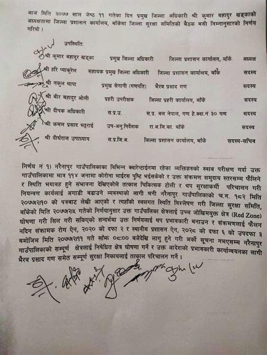 गाउँपालिकाले शनिबार मात्र कोरोना संक्रमण फैलिन सक्ने र स्थित भयावहक हुने भन्दै थप सुरक्षाकर्मी र स्वास्थ्यकर्मी माग गर्दै जिल्ला प्रशासन कार्यालय बाँकेलाई पत्राचार गरेको थियो ।