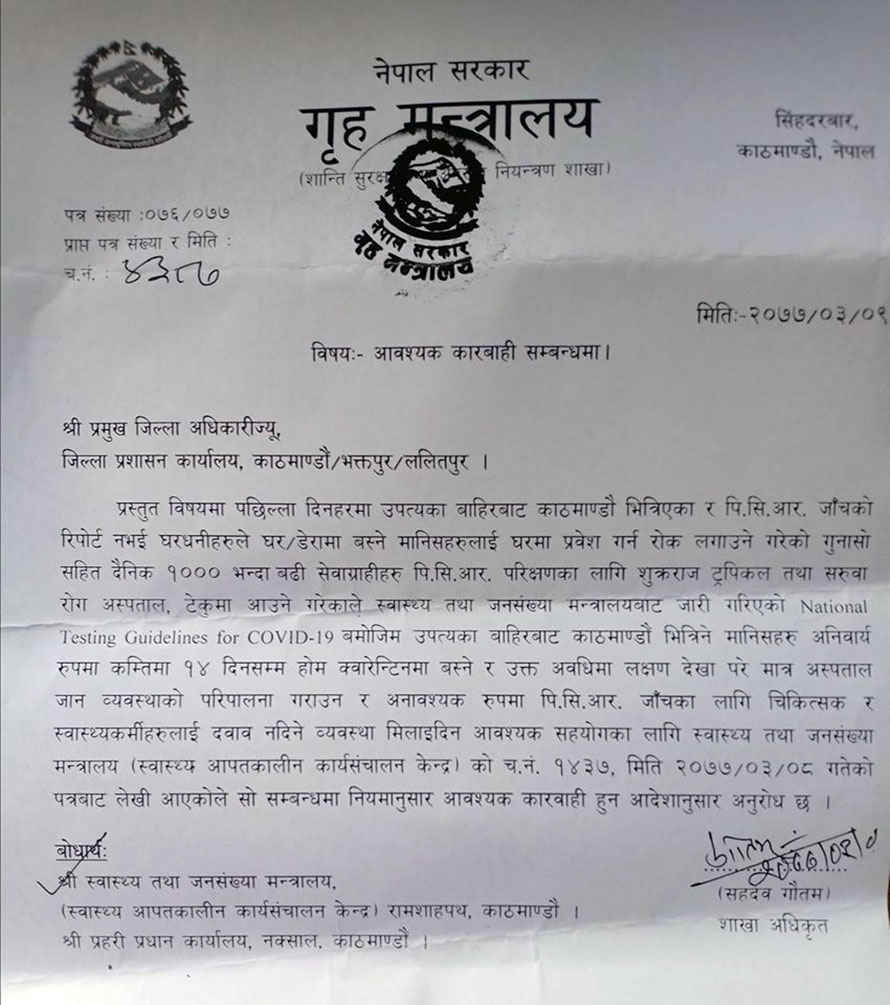 पीसीआर टेष्टका लागि आउनेहरु बढेपछि स्वास्थ्य तथा जनसंख्या मन्त्रालयले उपत्यका बाहिरबाट आउनेहरुलाई १४ दिनसम्म होम क्वारेन्टिनमा बस्ने र लक्षण देखिएमा मात्र अस्पताल आउने व्यवस्था गर्न गृहमा पत्र पठाएको छ ।