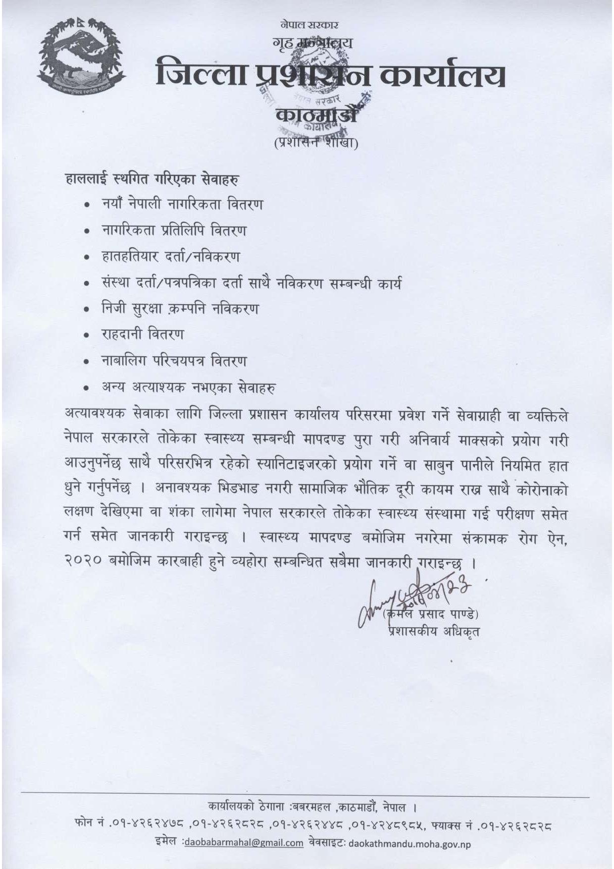 काठमाडौं, ललितपुर र भक्तपुरका कोरोना संकट व्यवस्थापन जिल्ला समितिको शुक्रबार बसेको संयुक्त बैठकले गरेको निर्णयअनुसार आजदेखि आगामी भदौ ८ गते सम्मका लागि नयाँ नेपाली नागरिकता वितरण, नागरिकता प्रतिलिपि वितरण, हातहतियार दर्ता नवीरकण, संस्था/पत्रपत्रिका दर्ता तथा नवीरकण, निजी सुरक्षा कम्पनी नवीकरण, राहदानी वितरण, नाबालिग परिचयपत्र वितरणलगायतका जिल्ला प्रशासन कार्यालयबाट प्रदान गरिने अत्यावश्यक बाहेकका सबै सेवा बन्द गरेका हुन् ।