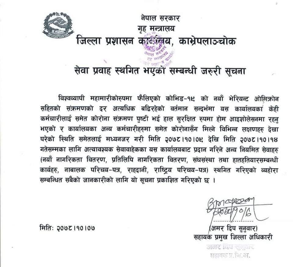 शुक्रबार सहायक प्रमुख जिल्ला अधिकारी अमरदीप सुनुवारले सुचना निकालेर माघ ९ देखि १४ गतेसम्मका लागि अत्यावश्यक बाहेकका सेवा बन्द गरिने जानकारी दिएका छन् । अत्यावश्यक सेवा बाहेक नयाँ नागरिकता, प्रतिलिपि नागरिकता, संघसंस्था, राहदानी, राष्ट्रिय परिचयपत्र, नाबालक परिचयपत्र लगायतका सेवा बन्द गर्ने निर्णय गरिएको सुचनामा जनाइएको छ ।