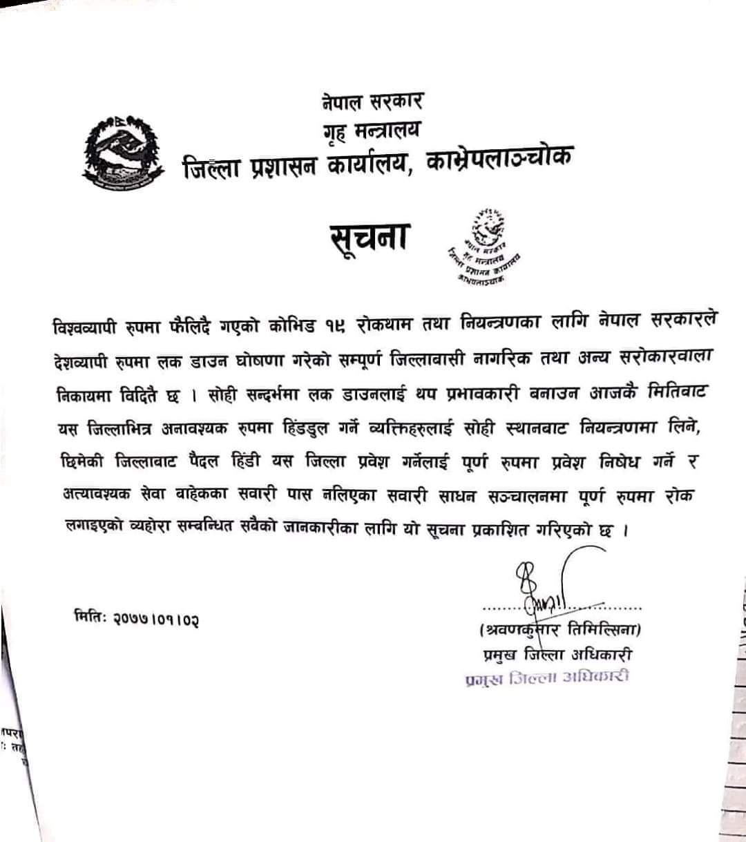 काठमाडौं उपत्यकाबाट अन्य जिल्लामा जानको लागि मनिसहरु काभ्रे जिल्ला हुँदै हुँदै अन्य जिल्लामा गैरहेकोले अब भने काभ्रे हुँदै जान नपाउनेगरी प्रशासनले रोक लगाएको हो ।