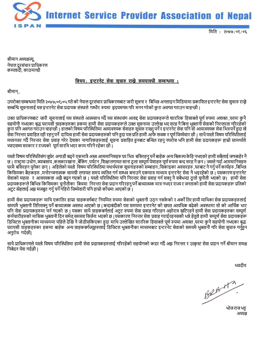 नेपाल दुरसन्चार प्राधिकरणले लकडाउन अवधिभर सेवा शुल्क नतिरेपनी ग्राहकको लाइन नकात्न भनेपछी ईन्टरनेट सेवा प्रदायक संघले उसलाई पत्र लेख्दै अशक्त तथा वृद्ध ग्राहक बाहेकलाई शुल्क नतिरी सेवा दिन नसकिने बताएको हो ।